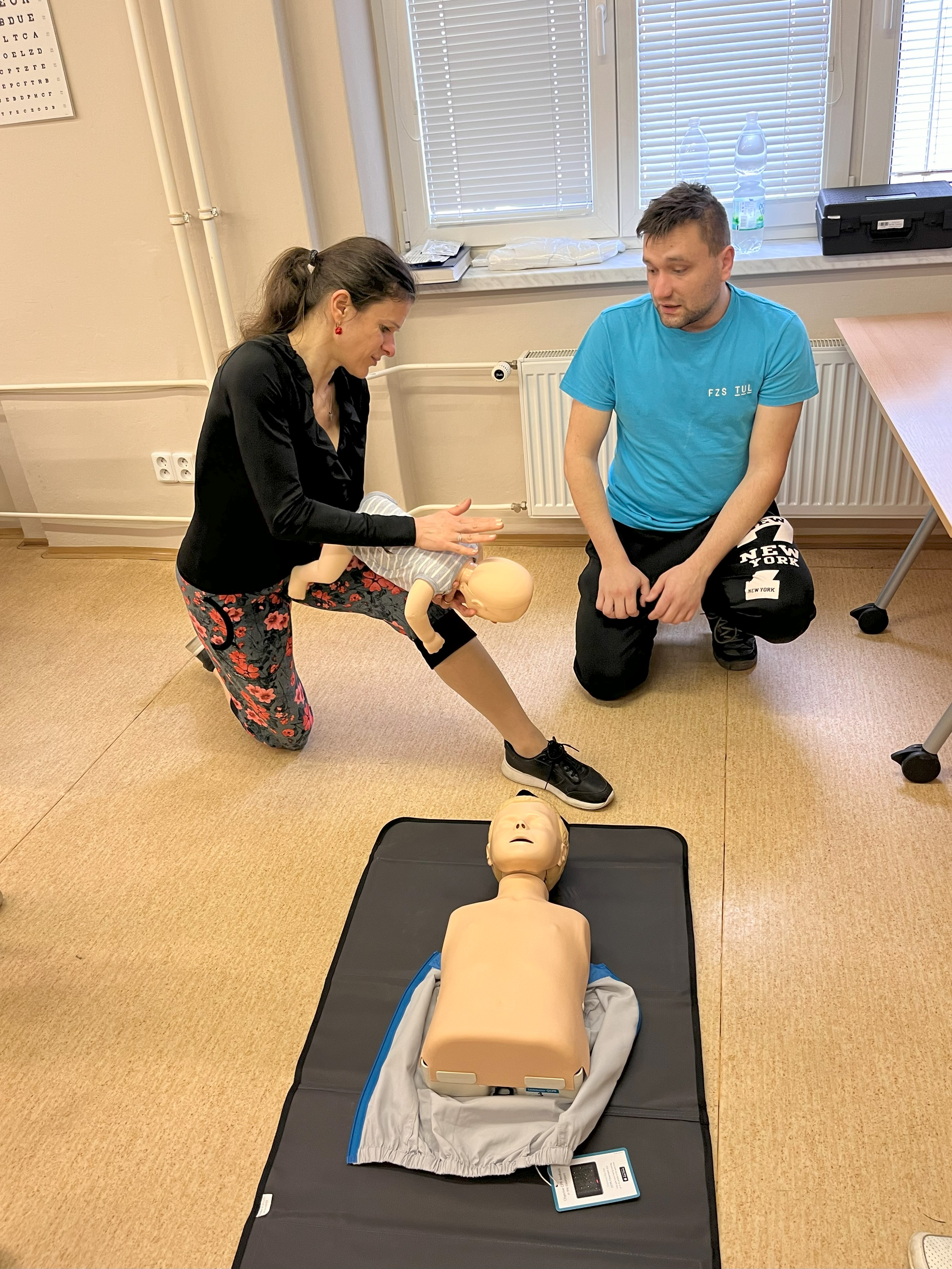 Anotace: Kurz je zaměřen na poskytnutí předlékařské první pomoci v nejčastěji se vyskytujících život ohrožujících stavech, se kterými se lze setkat v běžném životě. Od domácnosti, zaměstnání, veřejného prostoru, sportovních aktivit až po dopravní nehody. Náplní předmětu je nejen resuscitace dospělého a dítěte, nácvik bezpečného použití externího defibrilátoru, zástava masivního krvácení a ošetření poranění vzniklých úrazem, ale i první pomoc při náhlých interních onemocněních jako jsou např. cévní mozková příhoda, infarkt myokardu, diabetické kóma, astmatický záchvat a další. Nedílnou součástí výuky je i zvládnutí stresu a komunikace s operačním střediskem. Důraz je kladen na praktické zvládnutí první pomoci včetně výuky zážitkové (simulace reálné situace) a nácvik resuscitačních technik na výukových modelech.