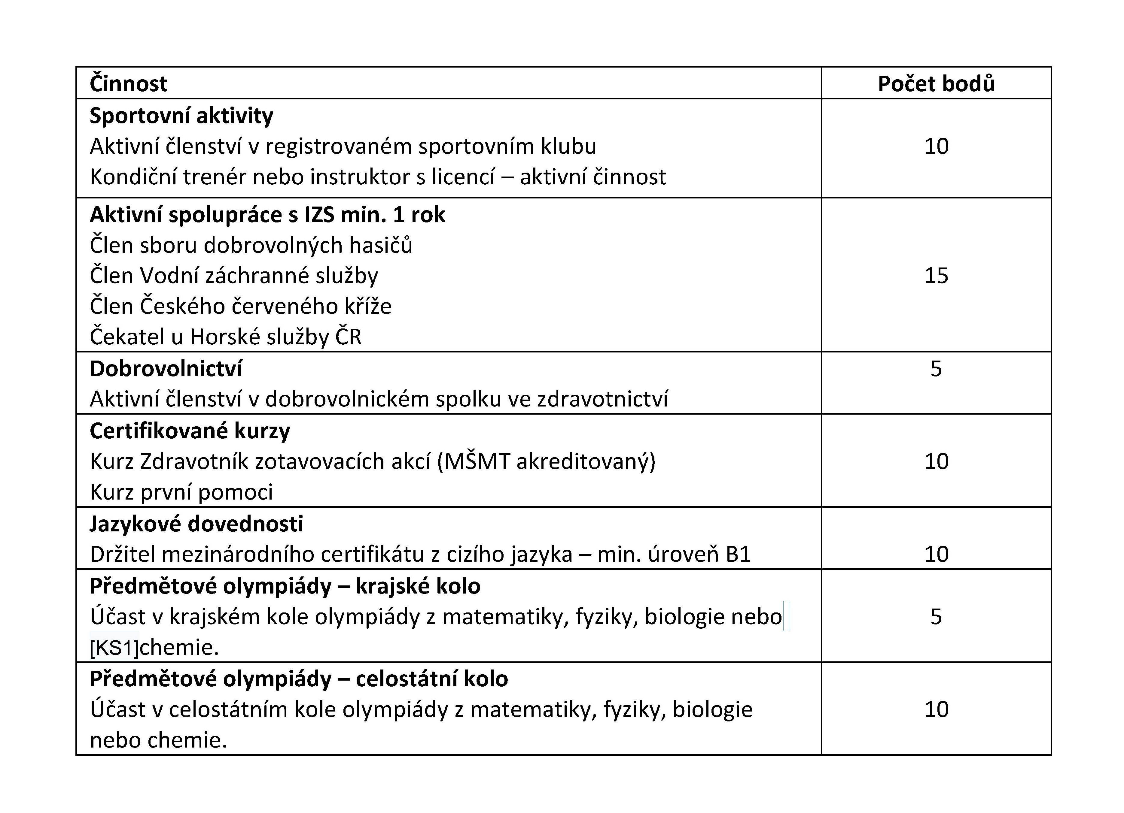 uvedených aktivit, které uchazeč vloží do přílohy přihlášky. Maximální výše připsaných bonusových bodů je 50.