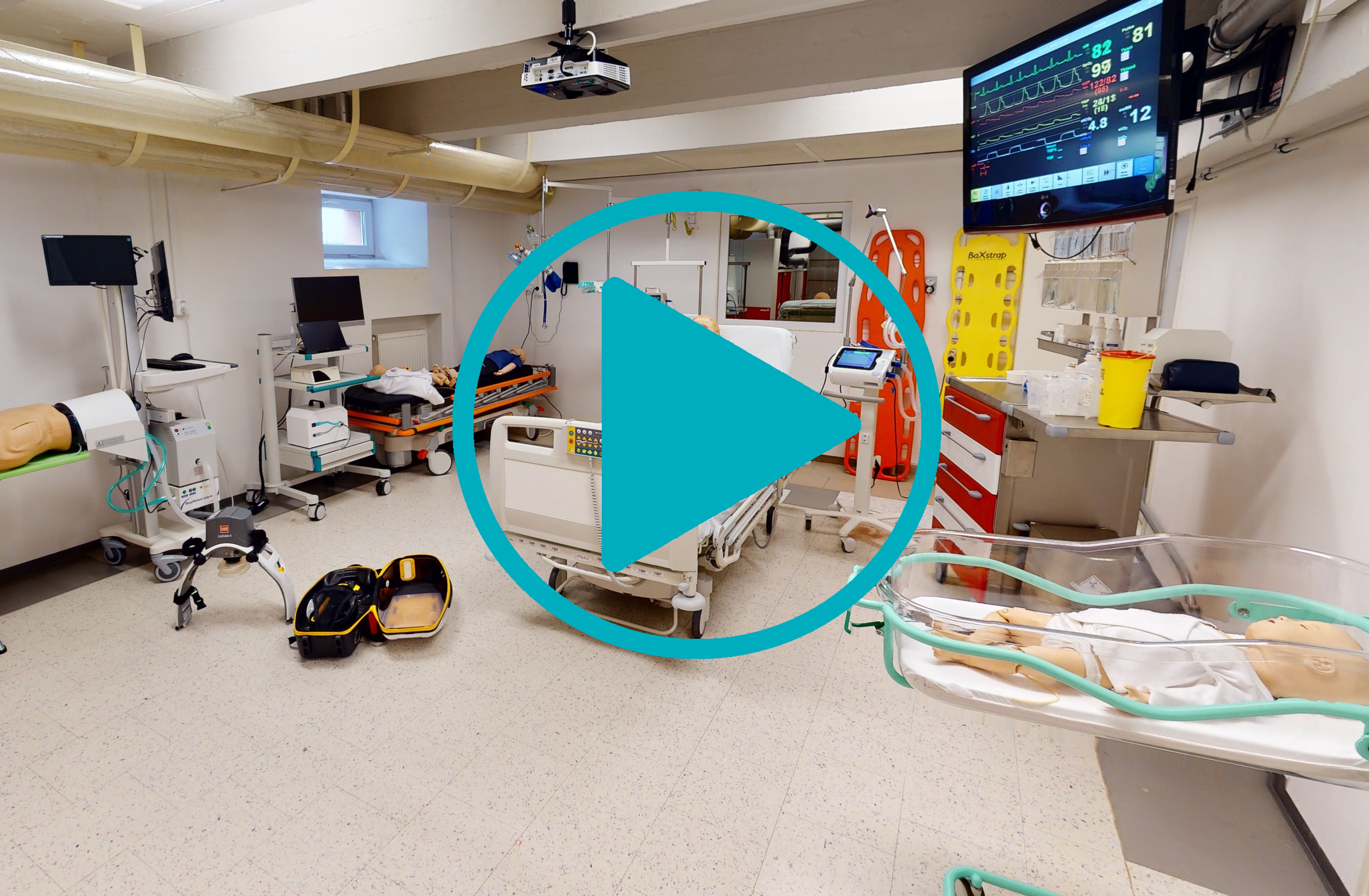 Součástí prohlídky jsou videa o našem sanitním voze, virtuálním pitevním stole, pacientském simulátoru SIMMAN 3G nebo přístroji LUCAS 3 k nepřímé masáži srdce.